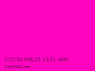 XYZ 50.698,25.13,51.469 Color is a normal magenta color and the nearest color is Shocking Pink #fc0fc0. Hex code #ff05bf and RGB value is rgb(255,5,191). In RGB color space, this color is composed of 100% red, 2% green, 75% blue, In CMYK color space, this color is composed of 0% cyan, 98% magenta, 25% yellow , 0% black , In HSL color space, this color has a hue angle of 315° , 100% saturation and 51% lightness.