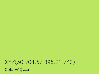 XYZ 50.704,67.896,21.742 Color is a light green color and the nearest color is Inchworm #b2ec5d. Hex code #bae661 and RGB value is rgb(186,230,97). In RGB color space, this color is composed of 73% red, 90% green, 38% blue, In CMYK color space, this color is composed of 19% cyan, 0% magenta, 58% yellow , 10% black , In HSL color space, this color has a hue angle of 80° , 73% saturation and 64% lightness.