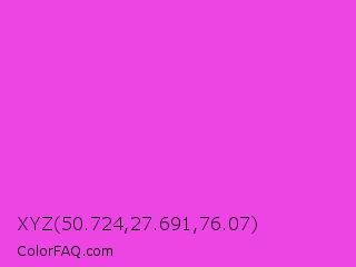 XYZ 50.724,27.691,76.07 Color is a normal magenta color and the nearest color is Purple Pizzazz #fe4eda. Hex code #ec45e4 and RGB value is rgb(236,69,228). In RGB color space, this color is composed of 93% red, 27% green, 89% blue, In CMYK color space, this color is composed of 0% cyan, 71% magenta, 3% yellow , 7% black , In HSL color space, this color has a hue angle of 303° , 81% saturation and 60% lightness.