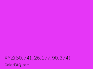 XYZ 50.741,26.177,90.374 Color is a normal magenta color and the nearest color is Purple Pizzazz #fe4eda. Hex code #e636f7 and RGB value is rgb(230,54,247). In RGB color space, this color is composed of 90% red, 21% green, 97% blue, In CMYK color space, this color is composed of 7% cyan, 78% magenta, 0% yellow , 3% black , In HSL color space, this color has a hue angle of 295° , 92% saturation and 59% lightness.