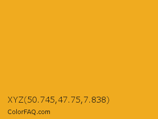 XYZ 50.745,47.75,7.838 Color is a normal orange color and the nearest color is Fuel Yellow #eca927. Hex code #f0ab1f and RGB value is rgb(240,171,31). In RGB color space, this color is composed of 94% red, 67% green, 12% blue, In CMYK color space, this color is composed of 0% cyan, 29% magenta, 87% yellow , 6% black , In HSL color space, this color has a hue angle of 40° , 87% saturation and 53% lightness.