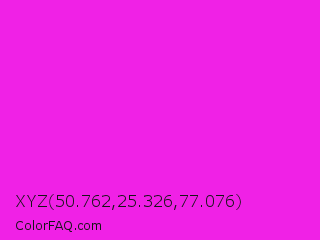 XYZ 50.762,25.326,77.076 Color is a normal magenta color and the nearest color is Hot Magenta #ff1dce. Hex code #f021e6 and RGB value is rgb(240,33,230). In RGB color space, this color is composed of 94% red, 13% green, 90% blue, In CMYK color space, this color is composed of 0% cyan, 86% magenta, 4% yellow , 6% black , In HSL color space, this color has a hue angle of 303° , 87% saturation and 54% lightness.