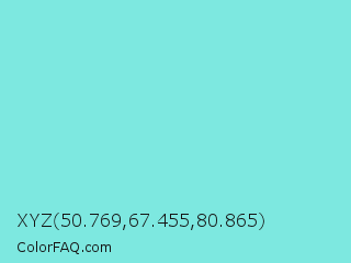XYZ 50.769,67.455,80.865 Color is a light cyan color and the nearest color is Spray #79deec. Hex code #7de8e0 and RGB value is rgb(125,232,224). In RGB color space, this color is composed of 49% red, 91% green, 88% blue, In CMYK color space, this color is composed of 46% cyan, 0% magenta, 3% yellow , 9% black , In HSL color space, this color has a hue angle of 176° , 70% saturation and 70% lightness.