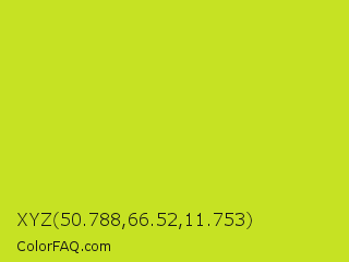 XYZ 50.788,66.52,11.753 Color is a normal yellow color and the nearest color is Pear #d1e231. Hex code #c6e223 and RGB value is rgb(198,226,35). In RGB color space, this color is composed of 78% red, 89% green, 14% blue, In CMYK color space, this color is composed of 12% cyan, 0% magenta, 85% yellow , 11% black , In HSL color space, this color has a hue angle of 69° , 77% saturation and 51% lightness.