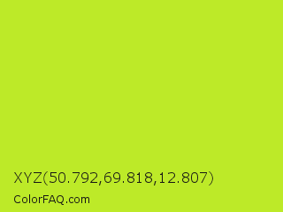 XYZ 50.792,69.818,12.807 Color is a normal lime color and the nearest color is Pear #d1e231. Hex code #bdea28 and RGB value is rgb(189,234,40). In RGB color space, this color is composed of 74% red, 92% green, 16% blue, In CMYK color space, this color is composed of 19% cyan, 0% magenta, 83% yellow , 8% black , In HSL color space, this color has a hue angle of 74° , 82% saturation and 54% lightness.