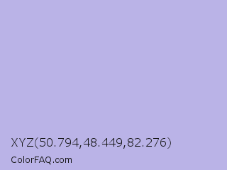 XYZ 50.794,48.449,82.276 Color is a light indigo color and the nearest color is Maximum Blue Purple #acace6. Hex code #bab3e7 and RGB value is rgb(186,179,231). In RGB color space, this color is composed of 73% red, 70% green, 91% blue, In CMYK color space, this color is composed of 19% cyan, 23% magenta, 0% yellow , 9% black , In HSL color space, this color has a hue angle of 248° , 52% saturation and 80% lightness.