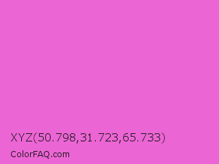 XYZ 50.798,31.723,65.733 Color is a light magenta color and the nearest color is Orchid #da70d6. Hex code #eb65d4 and RGB value is rgb(235,101,212). In RGB color space, this color is composed of 92% red, 40% green, 83% blue, In CMYK color space, this color is composed of 0% cyan, 57% magenta, 10% yellow , 8% black , In HSL color space, this color has a hue angle of 310° , 77% saturation and 66% lightness.