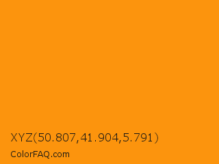 XYZ 50.807,41.904,5.791 Color is a normal orange color and the nearest color is West Side #ff910f. Hex code #fc940d and RGB value is rgb(252,148,13). In RGB color space, this color is composed of 99% red, 58% green, 5% blue, In CMYK color space, this color is composed of 0% cyan, 41% magenta, 95% yellow , 1% black , In HSL color space, this color has a hue angle of 34° , 98% saturation and 52% lightness.
