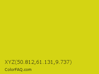 XYZ 50.812,61.131,9.737 Color is a normal yellow color and the nearest color is Bird Flower #d4cd16. Hex code #d4d413 and RGB value is rgb(212,212,19). In RGB color space, this color is composed of 83% red, 83% green, 7% blue, In CMYK color space, this color is composed of 0% cyan, 0% magenta, 91% yellow , 17% black , In HSL color space, this color has a hue angle of 60° , 84% saturation and 45% lightness.