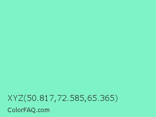 XYZ 50.817,72.585,65.365 Color is a light green color and the nearest color is Aquamarine #7fffd4. Hex code #7df3c7 and RGB value is rgb(125,243,199). In RGB color space, this color is composed of 49% red, 95% green, 78% blue, In CMYK color space, this color is composed of 49% cyan, 0% magenta, 18% yellow , 5% black , In HSL color space, this color has a hue angle of 158° , 83% saturation and 72% lightness.