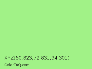 XYZ 50.823,72.831,34.301 Color is a light green color and the nearest color is Light Green #90ee90. Hex code #a1f287 and RGB value is rgb(161,242,135). In RGB color space, this color is composed of 63% red, 95% green, 53% blue, In CMYK color space, this color is composed of 33% cyan, 0% magenta, 44% yellow , 5% black , In HSL color space, this color has a hue angle of 105° , 80% saturation and 74% lightness.