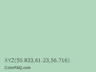 XYZ 50.833,61.23,56.716 Color is a light green color and the nearest color is Gum Leaf #b6d3bf. Hex code #aed7bc and RGB value is rgb(174,215,188). In RGB color space, this color is composed of 68% red, 84% green, 74% blue, In CMYK color space, this color is composed of 19% cyan, 0% magenta, 13% yellow , 16% black , In HSL color space, this color has a hue angle of 140° , 34% saturation and 76% lightness.