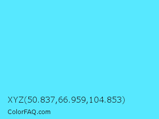 XYZ 50.837,66.959,104.853 Color is a light cyan color and the nearest color is Turquoise Blue #6cdae7. Hex code #57e8ff and RGB value is rgb(87,232,255). In RGB color space, this color is composed of 34% red, 91% green, 100% blue, In CMYK color space, this color is composed of 66% cyan, 9% magenta, 0% yellow , 0% black , In HSL color space, this color has a hue angle of 188° , 100% saturation and 67% lightness.
