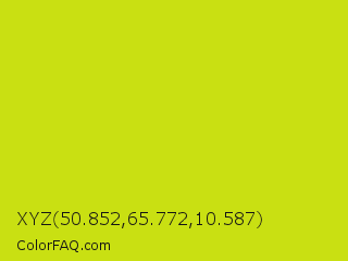 XYZ 50.852,65.772,10.587 Color is a normal yellow color and the nearest color is Bitter Lemon #cae00d. Hex code #c9e012 and RGB value is rgb(201,224,18). In RGB color space, this color is composed of 79% red, 88% green, 7% blue, In CMYK color space, this color is composed of 10% cyan, 0% magenta, 92% yellow , 12% black , In HSL color space, this color has a hue angle of 67° , 85% saturation and 47% lightness.