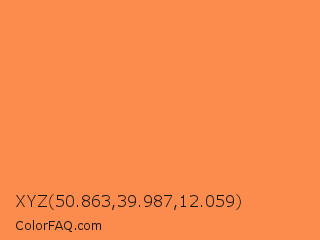 XYZ 50.863,39.987,12.059 Color is a light orange color and the nearest color is Coral #ff7f50. Hex code #fc8c4d and RGB value is rgb(252,140,77). In RGB color space, this color is composed of 99% red, 55% green, 30% blue, In CMYK color space, this color is composed of 0% cyan, 44% magenta, 69% yellow , 1% black , In HSL color space, this color has a hue angle of 22° , 97% saturation and 65% lightness.
