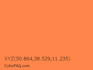 XYZ 50.864,38.529,11.235 Color is a light orange color and the nearest color is Mango Tango #ff8243. Hex code #ff854a and RGB value is rgb(255,133,74). In RGB color space, this color is composed of 100% red, 52% green, 29% blue, In CMYK color space, this color is composed of 0% cyan, 48% magenta, 71% yellow , 0% black , In HSL color space, this color has a hue angle of 20° , 100% saturation and 65% lightness.
