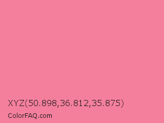 XYZ 50.898,36.812,35.875 Color is a light red color and the nearest color is Tickle Me Pink Crayola #fc80a5. Hex code #f47f9c and RGB value is rgb(244,127,156). In RGB color space, this color is composed of 96% red, 50% green, 61% blue, In CMYK color space, this color is composed of 0% cyan, 48% magenta, 36% yellow , 4% black , In HSL color space, this color has a hue angle of 345° , 84% saturation and 73% lightness.