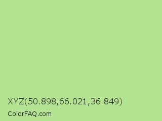 XYZ 50.898,66.021,36.849 Color is a light green color and the nearest color is Granny Smith Apple #a8e4a0. Hex code #b3e291 and RGB value is rgb(179,226,145). In RGB color space, this color is composed of 70% red, 89% green, 57% blue, In CMYK color space, this color is composed of 21% cyan, 0% magenta, 36% yellow , 11% black , In HSL color space, this color has a hue angle of 95° , 58% saturation and 73% lightness.