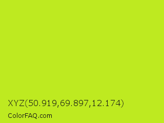 XYZ 50.919,69.897,12.174 Color is a normal lime color and the nearest color is Las Palmas #c6e610. Hex code #beea20 and RGB value is rgb(190,234,32). In RGB color space, this color is composed of 75% red, 92% green, 13% blue, In CMYK color space, this color is composed of 19% cyan, 0% magenta, 86% yellow , 8% black , In HSL color space, this color has a hue angle of 73° , 83% saturation and 52% lightness.