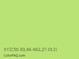 XYZ 50.93,66.662,27.012 Color is a light green color and the nearest color is Yellow Green #c5e17a. Hex code #bae375 and RGB value is rgb(186,227,117). In RGB color space, this color is composed of 73% red, 89% green, 46% blue, In CMYK color space, this color is composed of 18% cyan, 0% magenta, 48% yellow , 11% black , In HSL color space, this color has a hue angle of 82° , 66% saturation and 67% lightness.