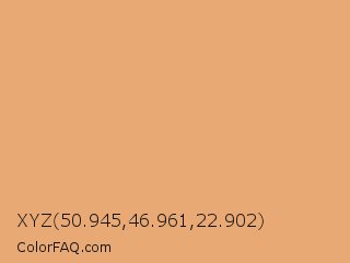 XYZ 50.945,46.961,22.902 Color is a light orange color and the nearest color is Fawn #e5aa70. Hex code #e9a974 and RGB value is rgb(233,169,116). In RGB color space, this color is composed of 91% red, 66% green, 45% blue, In CMYK color space, this color is composed of 0% cyan, 27% magenta, 50% yellow , 9% black , In HSL color space, this color has a hue angle of 27° , 73% saturation and 68% lightness.