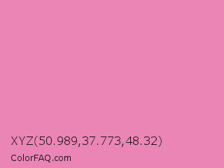 XYZ 50.989,37.773,48.32 Color is a light rose color and the nearest color is Carissma #ea88a8. Hex code #eb85b5 and RGB value is rgb(235,133,181). In RGB color space, this color is composed of 92% red, 52% green, 71% blue, In CMYK color space, this color is composed of 0% cyan, 43% magenta, 23% yellow , 8% black , In HSL color space, this color has a hue angle of 332° , 72% saturation and 72% lightness.
