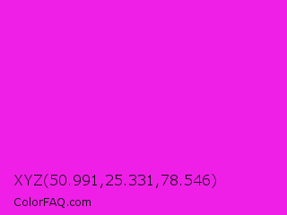 XYZ 50.991,25.331,78.546 Color is a normal magenta color and the nearest color is Hot Magenta #ff1dce. Hex code #f01fe8 and RGB value is rgb(240,31,232). In RGB color space, this color is composed of 94% red, 12% green, 91% blue, In CMYK color space, this color is composed of 0% cyan, 87% magenta, 3% yellow , 6% black , In HSL color space, this color has a hue angle of 302° , 87% saturation and 53% lightness.