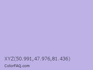 XYZ 50.991,47.976,81.436 Color is a light indigo color and the nearest color is Maximum Blue Purple #acace6. Hex code #bdb1e6 and RGB value is rgb(189,177,230). In RGB color space, this color is composed of 74% red, 69% green, 90% blue, In CMYK color space, this color is composed of 18% cyan, 23% magenta, 0% yellow , 10% black , In HSL color space, this color has a hue angle of 254° , 51% saturation and 80% lightness.