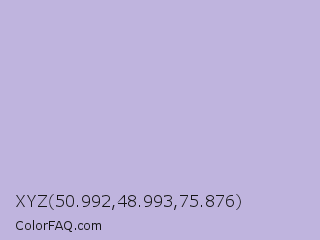 XYZ 50.992,48.993,75.876 Color is a light indigo color and the nearest color is Lavender Gray #bdbbd7. Hex code #bfb4de and RGB value is rgb(191,180,222). In RGB color space, this color is composed of 75% red, 71% green, 87% blue, In CMYK color space, this color is composed of 14% cyan, 19% magenta, 0% yellow , 13% black , In HSL color space, this color has a hue angle of 256° , 39% saturation and 79% lightness.