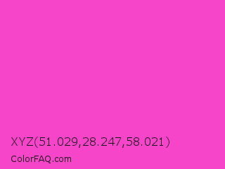XYZ 51.029,28.247,58.021 Color is a light magenta color and the nearest color is Razzle Dazzle Rose #ff33cc. Hex code #f745c9 and RGB value is rgb(247,69,201). In RGB color space, this color is composed of 97% red, 27% green, 79% blue, In CMYK color space, this color is composed of 0% cyan, 72% magenta, 19% yellow , 3% black , In HSL color space, this color has a hue angle of 316° , 92% saturation and 62% lightness.