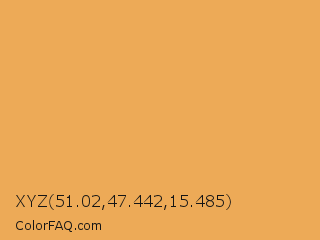 XYZ 51.02,47.442,15.485 Color is a light orange color and the nearest color is Sunray #e3ab57. Hex code #edaa57 and RGB value is rgb(237,170,87). In RGB color space, this color is composed of 93% red, 67% green, 34% blue, In CMYK color space, this color is composed of 0% cyan, 28% magenta, 63% yellow , 7% black , In HSL color space, this color has a hue angle of 33° , 81% saturation and 64% lightness.