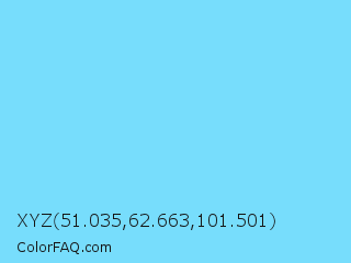 XYZ 51.035,62.663,101.501 Color is a light blue color and the nearest color is Spray #79deec. Hex code #77ddfc and RGB value is rgb(119,221,252). In RGB color space, this color is composed of 47% red, 87% green, 99% blue, In CMYK color space, this color is composed of 53% cyan, 12% magenta, 0% yellow , 1% black , In HSL color space, this color has a hue angle of 194° , 96% saturation and 73% lightness.