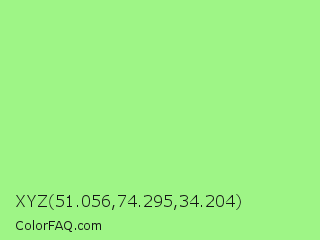 XYZ 51.056,74.295,34.204 Color is a light green color and the nearest color is Light Green #90ee90. Hex code #9ef586 and RGB value is rgb(158,245,134). In RGB color space, this color is composed of 62% red, 96% green, 53% blue, In CMYK color space, this color is composed of 36% cyan, 0% magenta, 45% yellow , 4% black , In HSL color space, this color has a hue angle of 107° , 85% saturation and 74% lightness.
