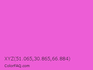 XYZ 51.065,30.865,66.884 Color is a light magenta color and the nearest color is Light Deep Pink #ff5ccd. Hex code #ed5ed6 and RGB value is rgb(237,94,214). In RGB color space, this color is composed of 93% red, 37% green, 84% blue, In CMYK color space, this color is composed of 0% cyan, 60% magenta, 10% yellow , 7% black , In HSL color space, this color has a hue angle of 310° , 80% saturation and 65% lightness.