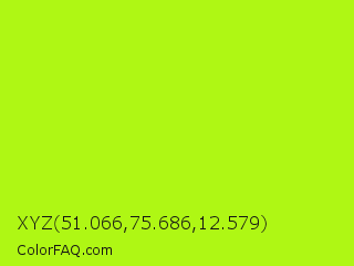 XYZ 51.066,75.686,12.579 Color is a normal lime color and the nearest color is Inch Worm #b0e313. Hex code #aff714 and RGB value is rgb(175,247,20). In RGB color space, this color is composed of 69% red, 97% green, 8% blue, In CMYK color space, this color is composed of 29% cyan, 0% magenta, 92% yellow , 3% black , In HSL color space, this color has a hue angle of 79° , 93% saturation and 52% lightness.