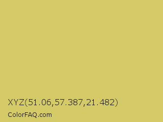 XYZ 51.06,57.387,21.482 Color is a light yellow color and the nearest color is Tacha #d6c562. Hex code #d5ca68 and RGB value is rgb(213,202,104). In RGB color space, this color is composed of 84% red, 79% green, 41% blue, In CMYK color space, this color is composed of 0% cyan, 5% magenta, 51% yellow , 16% black , In HSL color space, this color has a hue angle of 54° , 56% saturation and 62% lightness.