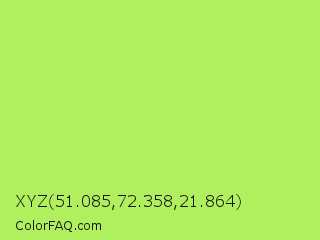 XYZ 51.085,72.358,21.864 Color is a light green color and the nearest color is Inchworm #b2ec5d. Hex code #b0f05e and RGB value is rgb(176,240,94). In RGB color space, this color is composed of 69% red, 94% green, 37% blue, In CMYK color space, this color is composed of 27% cyan, 0% magenta, 61% yellow , 6% black , In HSL color space, this color has a hue angle of 86° , 83% saturation and 65% lightness.