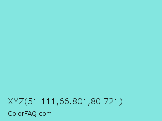 XYZ 51.111,66.801,80.721 Color is a light cyan color and the nearest color is Riptide #8be6d8. Hex code #83e6e0 and RGB value is rgb(131,230,224). In RGB color space, this color is composed of 51% red, 90% green, 88% blue, In CMYK color space, this color is composed of 43% cyan, 0% magenta, 3% yellow , 10% black , In HSL color space, this color has a hue angle of 176° , 66% saturation and 71% lightness.