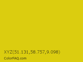 XYZ 51.131,58.757,9.098 Color is a normal yellow color and the nearest color is Bird Flower #d4cd16. Hex code #dbcd0f and RGB value is rgb(219,205,15). In RGB color space, this color is composed of 86% red, 80% green, 6% blue, In CMYK color space, this color is composed of 0% cyan, 6% magenta, 93% yellow , 14% black , In HSL color space, this color has a hue angle of 56° , 87% saturation and 46% lightness.