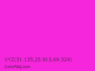 XYZ 51.135,25.913,69.324 Color is a normal magenta color and the nearest color is Hot Magenta #ff1dce. Hex code #f526db and RGB value is rgb(245,38,219). In RGB color space, this color is composed of 96% red, 15% green, 86% blue, In CMYK color space, this color is composed of 0% cyan, 84% magenta, 11% yellow , 4% black , In HSL color space, this color has a hue angle of 308° , 91% saturation and 55% lightness.