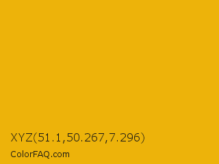 XYZ 51.1,50.267,7.296 Color is a normal orange color and the nearest color is Corn #e7bf05. Hex code #edb30a and RGB value is rgb(237,179,10). In RGB color space, this color is composed of 93% red, 70% green, 4% blue, In CMYK color space, this color is composed of 0% cyan, 24% magenta, 96% yellow , 7% black , In HSL color space, this color has a hue angle of 45° , 92% saturation and 48% lightness.