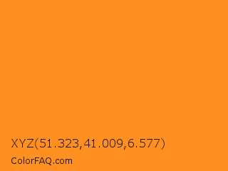 XYZ 51.323,41.009,6.577 Color is a normal orange color and the nearest color is Tree Poppy #fc9c1d. Hex code #ff8f20 and RGB value is rgb(255,143,32). In RGB color space, this color is composed of 100% red, 56% green, 13% blue, In CMYK color space, this color is composed of 0% cyan, 44% magenta, 87% yellow , 0% black , In HSL color space, this color has a hue angle of 30° , 100% saturation and 56% lightness.