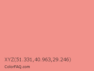 XYZ 51.331,40.963,29.246 Color is a light red color and the nearest color is Geraldine #fb8989. Hex code #f2918a and RGB value is rgb(242,145,138). In RGB color space, this color is composed of 95% red, 57% green, 54% blue, In CMYK color space, this color is composed of 0% cyan, 40% magenta, 43% yellow , 5% black , In HSL color space, this color has a hue angle of 4° , 80% saturation and 75% lightness.