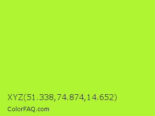 XYZ 51.338,74.874,14.652 Color is a normal green color and the nearest color is Green Lizard #a7f432. Hex code #b1f531 and RGB value is rgb(177,245,49). In RGB color space, this color is composed of 69% red, 96% green, 19% blue, In CMYK color space, this color is composed of 28% cyan, 0% magenta, 80% yellow , 4% black , In HSL color space, this color has a hue angle of 81° , 91% saturation and 58% lightness.