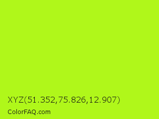 XYZ 51.352,75.826,12.907 Color is a normal lime color and the nearest color is Inch Worm #b0e313. Hex code #b0f71a and RGB value is rgb(176,247,26). In RGB color space, this color is composed of 69% red, 97% green, 10% blue, In CMYK color space, this color is composed of 29% cyan, 0% magenta, 89% yellow , 3% black , In HSL color space, this color has a hue angle of 79° , 93% saturation and 54% lightness.