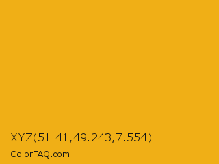 XYZ 51.41,49.243,7.554 Color is a normal orange color and the nearest color is Buttercup #f3ad16. Hex code #f0af16 and RGB value is rgb(240,175,22). In RGB color space, this color is composed of 94% red, 69% green, 9% blue, In CMYK color space, this color is composed of 0% cyan, 27% magenta, 91% yellow , 6% black , In HSL color space, this color has a hue angle of 42° , 88% saturation and 51% lightness.