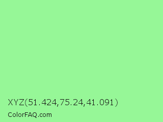 XYZ 51.424,75.24,41.091 Color is a light green color and the nearest color is Pale Green #98fb98. Hex code #96f797 and RGB value is rgb(150,247,151). In RGB color space, this color is composed of 59% red, 97% green, 59% blue, In CMYK color space, this color is composed of 39% cyan, 0% magenta, 39% yellow , 3% black , In HSL color space, this color has a hue angle of 121° , 86% saturation and 78% lightness.