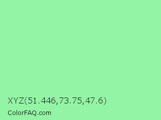 XYZ 51.446,73.75,47.6 Color is a light green color and the nearest color is Pale Green #98fb98. Hex code #94f4a6 and RGB value is rgb(148,244,166). In RGB color space, this color is composed of 58% red, 96% green, 65% blue, In CMYK color space, this color is composed of 39% cyan, 0% magenta, 32% yellow , 4% black , In HSL color space, this color has a hue angle of 131° , 81% saturation and 77% lightness.