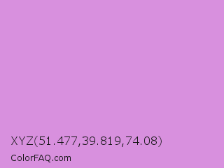 XYZ 51.477,39.819,74.08 Color is a light magenta color and the nearest color is Medium Lavender Magenta #dda0dd. Hex code #d890de and RGB value is rgb(216,144,222). In RGB color space, this color is composed of 85% red, 56% green, 87% blue, In CMYK color space, this color is composed of 3% cyan, 35% magenta, 0% yellow , 13% black , In HSL color space, this color has a hue angle of 295° , 54% saturation and 72% lightness.