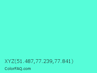 XYZ 51.487,77.239,77.841 Color is a light cyan color and the nearest color is Turquoise #40e0d0. Hex code #56fdd9 and RGB value is rgb(86,253,217). In RGB color space, this color is composed of 34% red, 99% green, 85% blue, In CMYK color space, this color is composed of 66% cyan, 0% magenta, 14% yellow , 1% black , In HSL color space, this color has a hue angle of 167° , 98% saturation and 66% lightness.